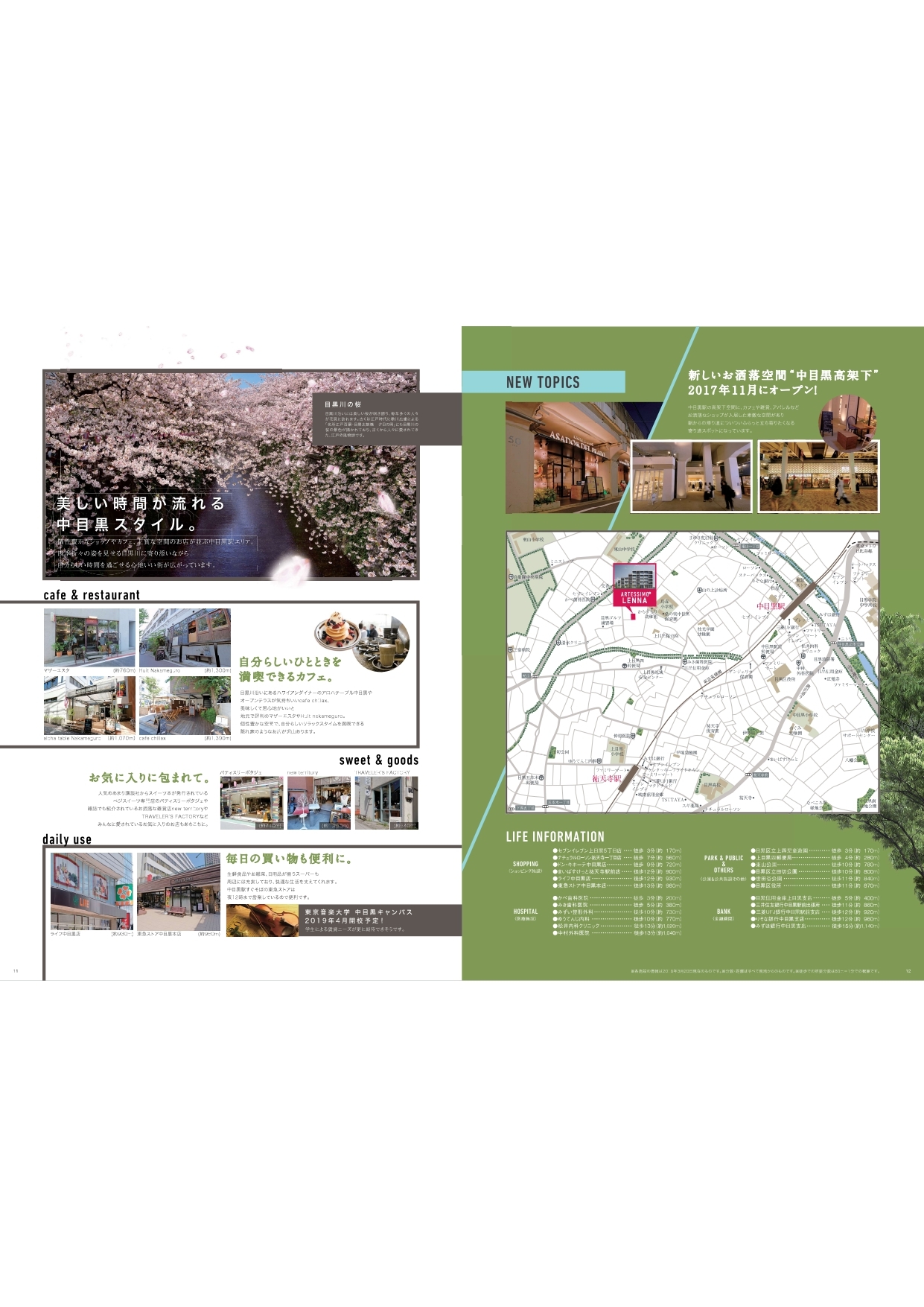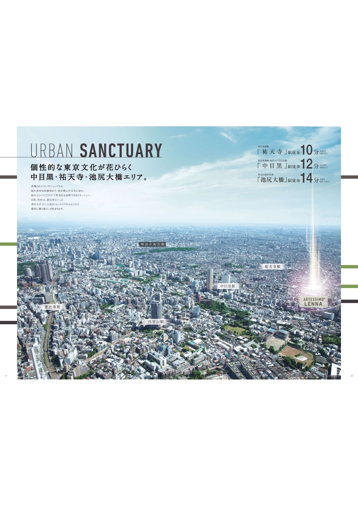 【エステムコート東京八王子】 「京王八王子」駅もよく利用されており、地元の方からは「京八(ケイハチ)」の愛称で親しまれています。「京王八王子」駅からは京王線で「新宿」駅まで直通で、特急ですと約40分で到着します。通勤時間帯にも新宿行きの特急・急行等も多く運転しており特急・急行料金はかかりません。 また京王八王子駅は始発駅ですので座って通勤することも可能です。 【ARTESSIMO LENNA】 個性的な東京文化が花ひらく中目黒・祐天寺・池尻大橋エリア。 洗練されたセレクトショップから隠れ家的な居酒屋まで、東京都心の文化に加え、桜の美しい目黒川や下町風情も満喫できるロケーション。 目黒、代官山、恵比寿といった都市生活者に人気の高いエリアのふところで感性に響く暮らしが始まります。